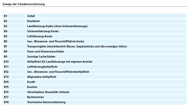 Die FINMA bewilligt jeweils einen oder mehrere Versicherungszweige (Art. 6 Abs. 3 VAG). Nach Anhang 1 zur Aufsichtsverordnung werden insgesamt 18 verschiedene Versicherungszweige der Schadenversicherung unterschieden.