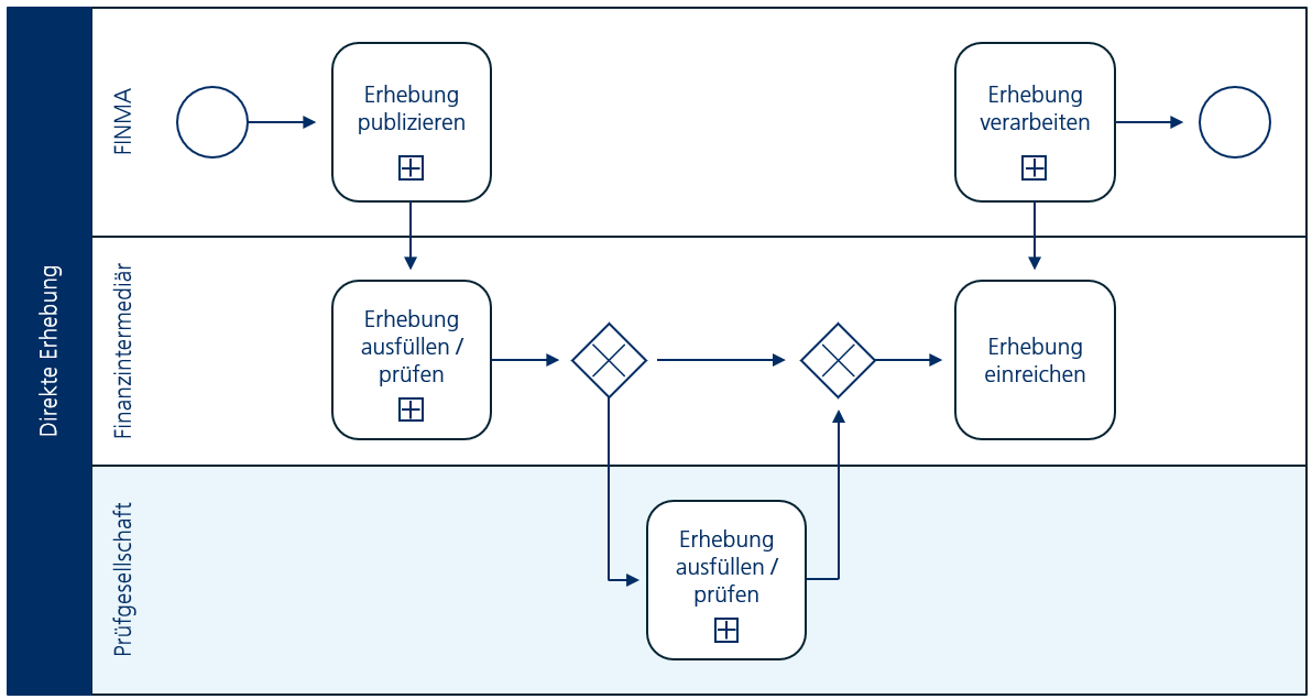 Testerhebungen an PG/AO: Die FINMA kann vorgängig Testerhebungen an PG oder AO publizieren. So können neue Funktionen sowie die Anbindung an eigene Systeme getestet werden. Testerhebungen sind entsprechend gekennzeichnet.