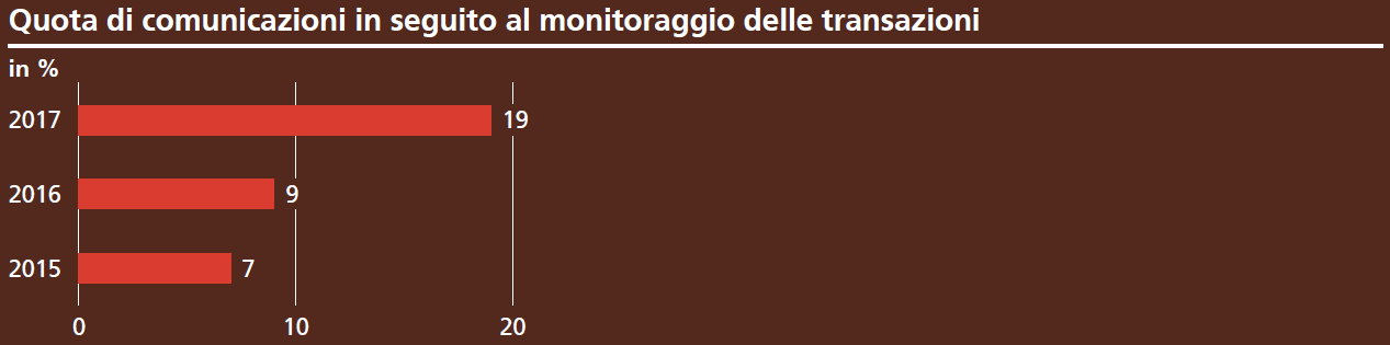 Negli ultimi anni gli intermediari finanziari svizzeri hanno individuato un numero più elevato di clienti sospetti e li hanno segnalati all’Ufficio di comunicazione in materia di riciclaggio di denaro (MROS). Anche il monitoraggio delle transazioni da parte degli intermediari finanziari ha contribuito all’aumento delle segnalazioni. La regolamentazione concede agli intermediari finanziari un certo margine di manovra nella strutturazione del monitoraggio delle transazioni, tuttavia esige che quest’ultimo venga impiegato in modo efficace.