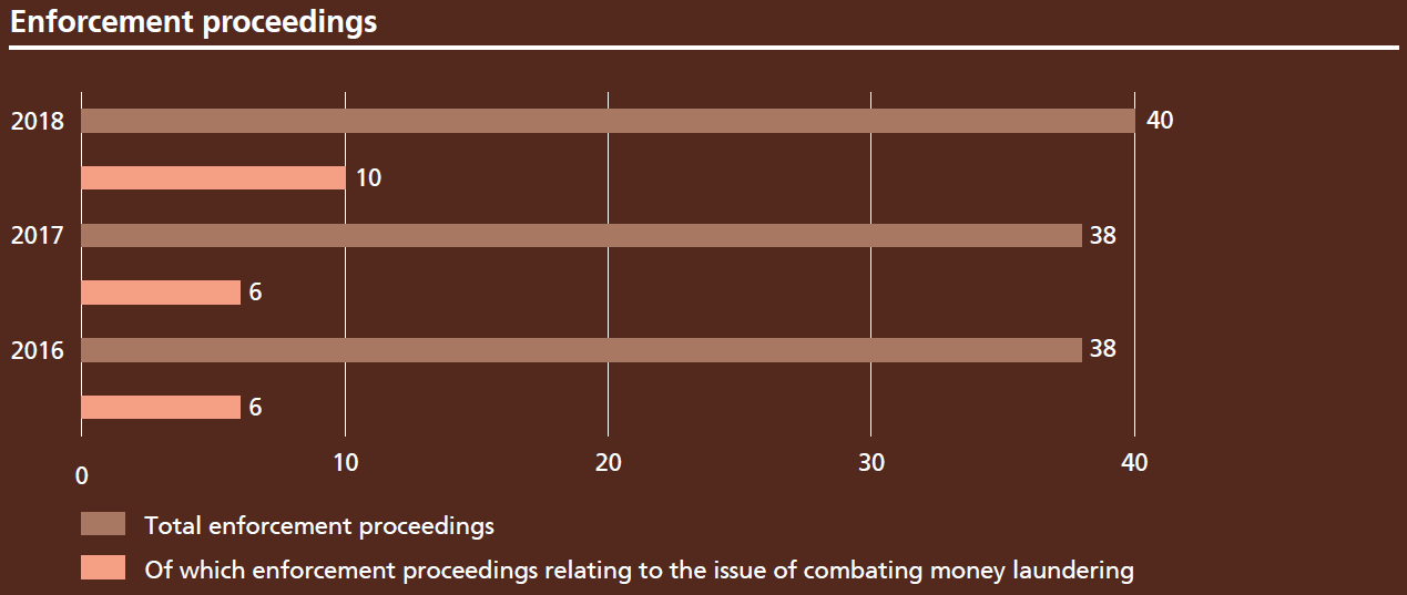 A major part of FINMA’s enforcement activities relates to the issue of combating money laundering. When FINMA has reason to believe there has been a breach of supervisory law, it may conduct an enforcement investigation. If FINMA considers that supervisory law has been breached and there is no other way to restore a normal state of affairs, it must initiate enforcement proceedings.