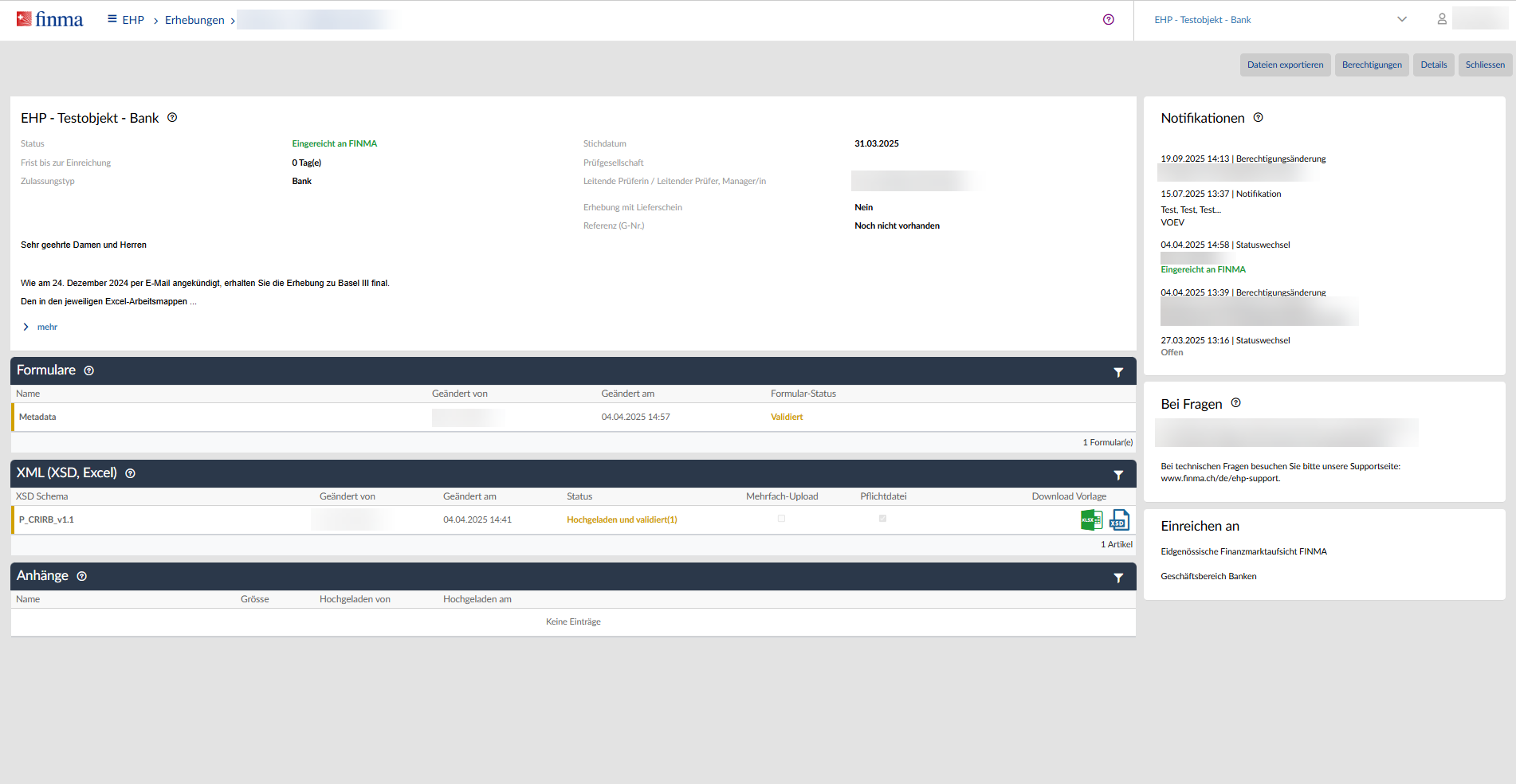 Toutes les pièces jointes que la FINMA fournit en lien avec un recensement (guides pratiques, explications, etc.) figurent dans la section «Pièces jointes» d’EHP.